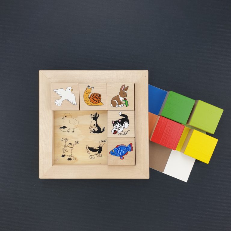Šī koka klucīšu spēle ir ideāls veids, kā attīstīt bērna vērīgumu, salīdzināšanas prasmes un kustību koordināciju. Sākumā bērns ar interesi pētīs dzīvnieciņu attēlus un centīsies likt klucīšus vienu virs otra. Laika gaitā mudiniet mazuli pats likt klucīšus kastītē, ievērojot attēlus un izvairoties no kļūdām, piemēram, pārliecinoties, ka cālītis nav ar kājām gaisā.