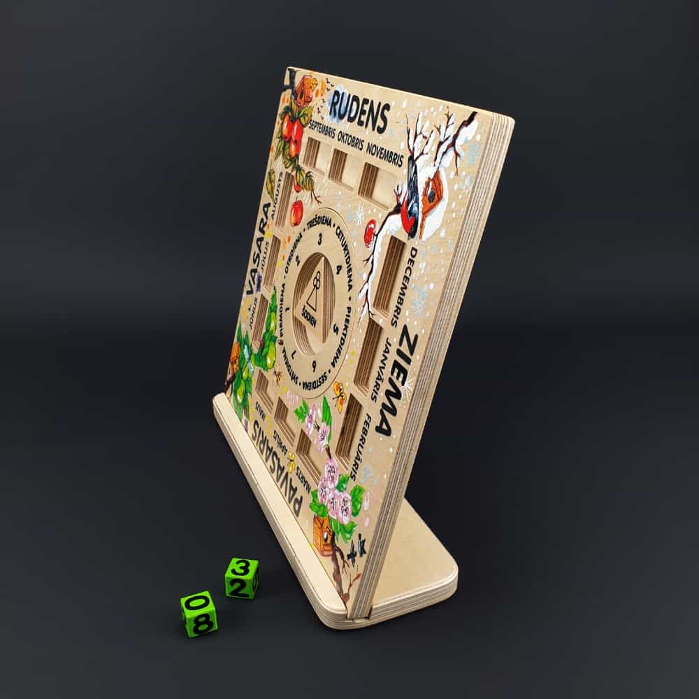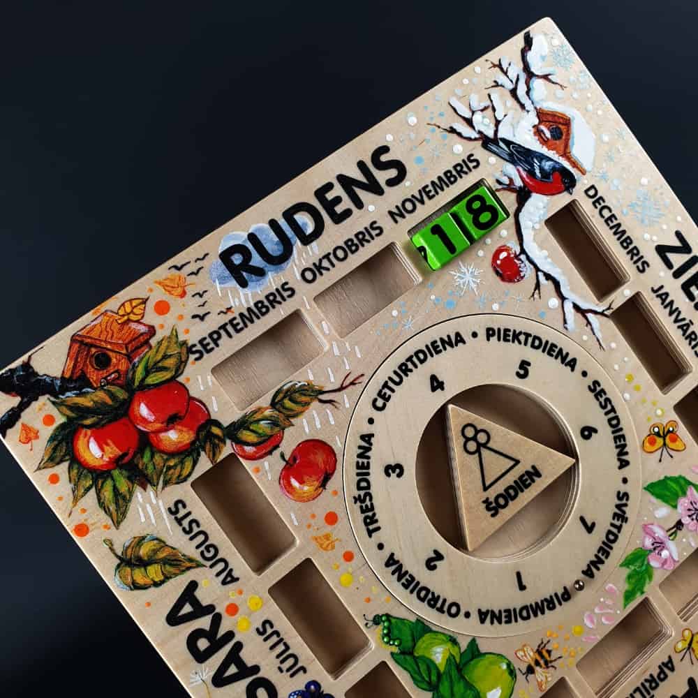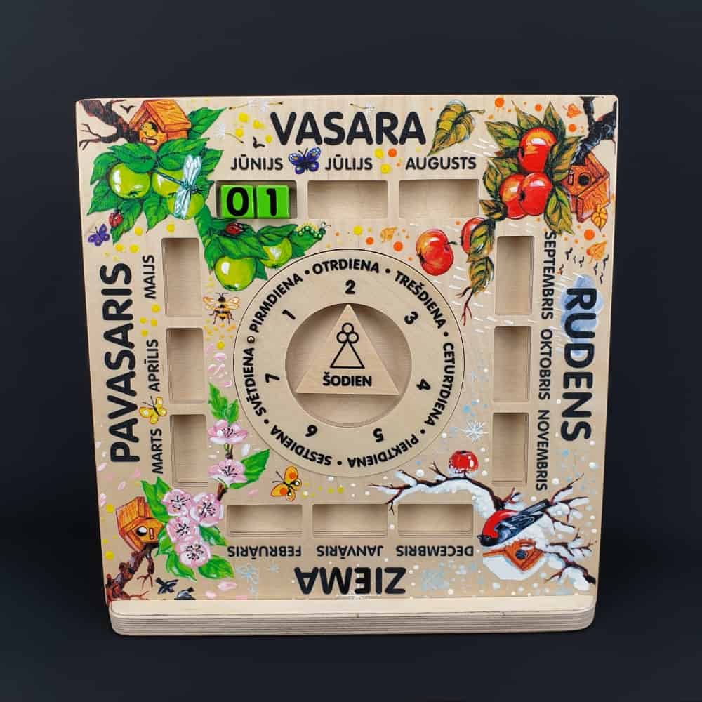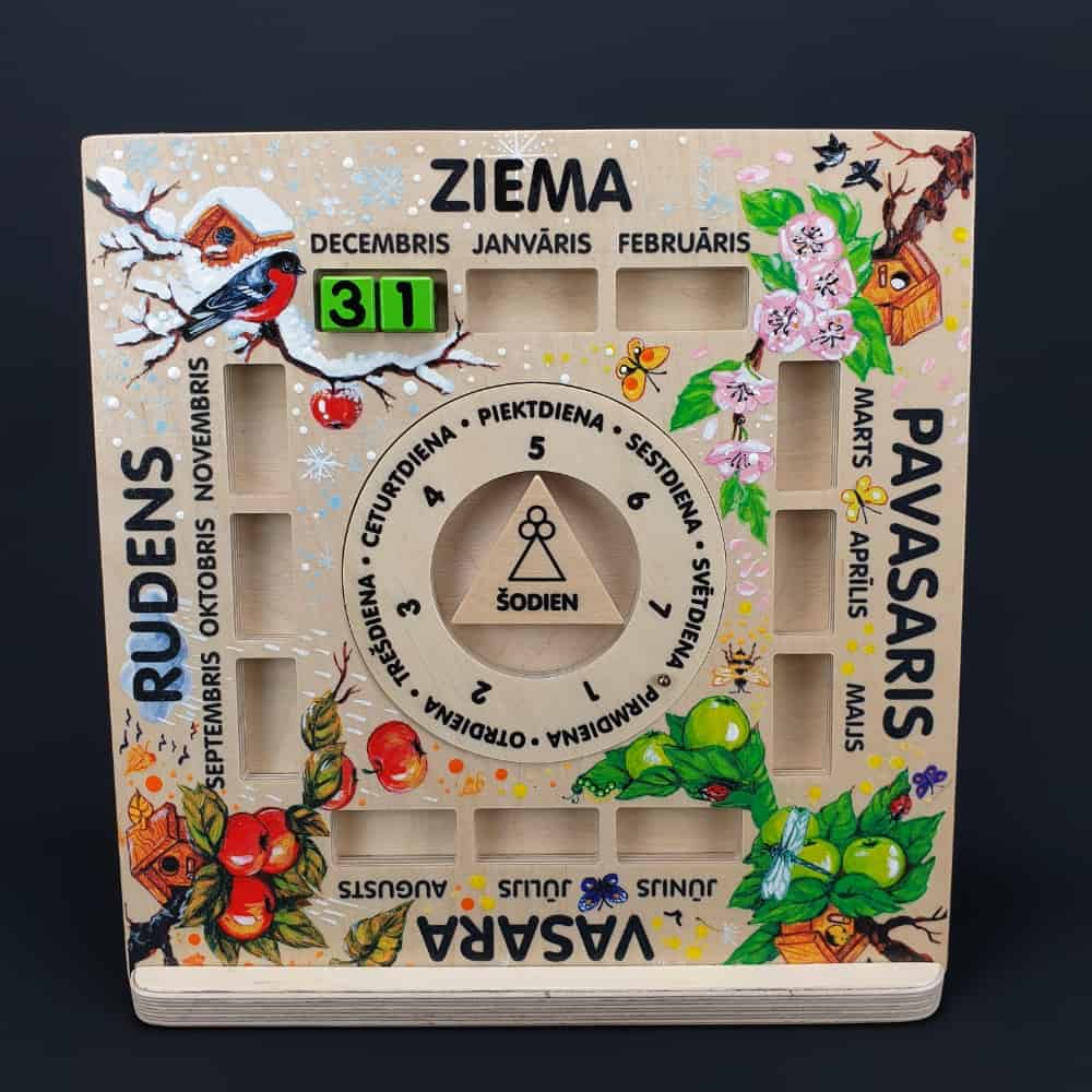 Praktiski darbojoties ar šo kalendāru bērns apgūs un iegaumēs gadalaiku secību un tiem atbilstošos mēnešus, dienu datumus un nedēļas dienu secību.