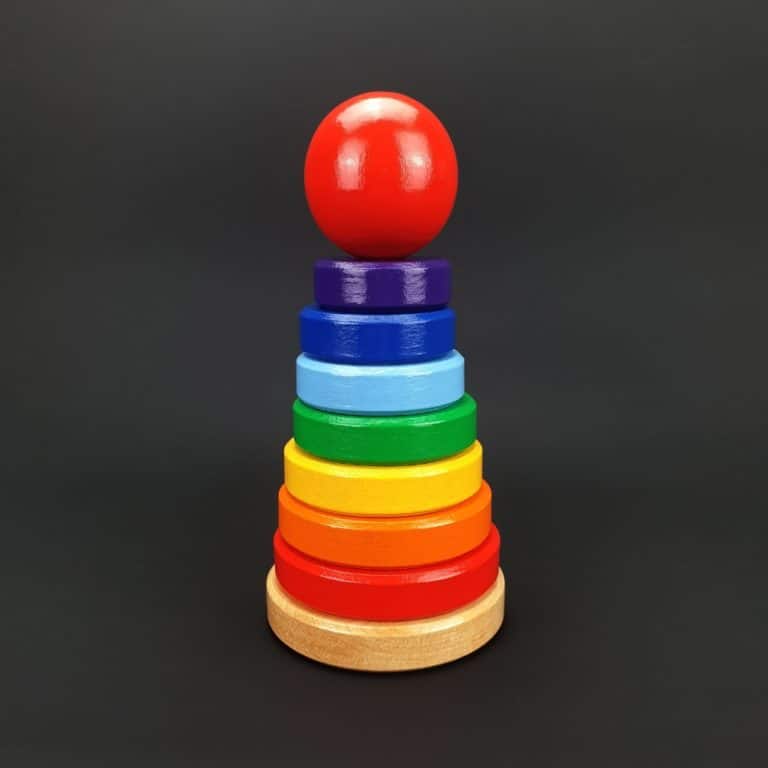 Spēlējoties ar šo piramīdu, bērns varēs novērtēt dažādu krāsu un izmēru koka ripiņas, kārtot tās pēc izmēra un krāsas. Komplektā ir īpaši sagatavota aukliņa, uz kuras var uzvērt visas ripiņas un bumbiņu, nodrošinot vēl lielāku izaicinājumu un attīstot bērna koordināciju un motoriku.