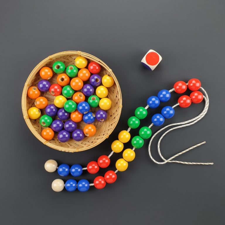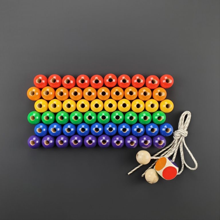 Veramā spēle ar koka bumbiņām attīsta smalko motoriku, roku un acu koordināciju, kā arī krāsu atpazīšanu. Komplektā ir 60 krāsainas bumbiņas (10 katras krāsas: sarkanas, oranžas, zaļas, zilas, dzeltenas, lillā), 1 krāsu metamais kauliņš un 2 īpaši sagatavotas auklas, kas piemērotas patīkamai vēršanai.