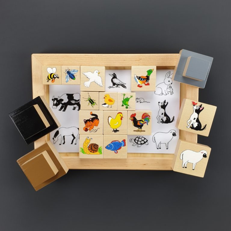 apgrieziet visus klucīšus ar krāsaino pusi uz augšu. Skaļi nosauciet vienu no jau iepriekš iepazītajiem dzīvnieciņiem, kuru bērnam jāatrod. Pareizi atminēto dzīvnieciņu var ielikt kastītē uz atbilstošā lauciņa. Ja pareizi atminēt neizdodas, tad klucītis jāgriež atpakaļ un jāmeklē no jauna. Vecāki bērni var sacensties, kurš atminēs vairāk pareizos klucīšus.