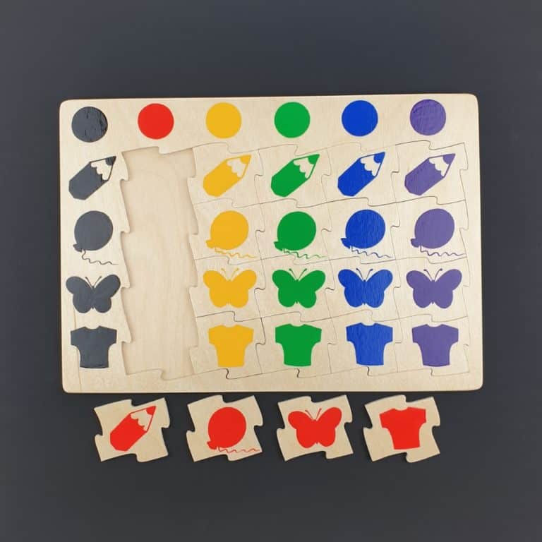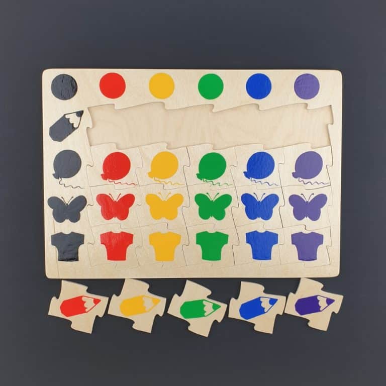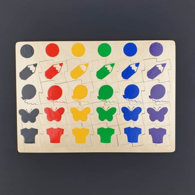 Sāciet ar bērna mudināšanu sistematizēt attēlus, sākot ar puzles gabaliem, piemēram, vispirms saliekot zīmuļus un pēc tam balonus. Pēc tam pievērsiet uzmanību krāsām – solīti pa solītim ļaujiet bērnam salikt visus sarkanos attēlus, tad pārējās krāsas pēc tāda paša principa.