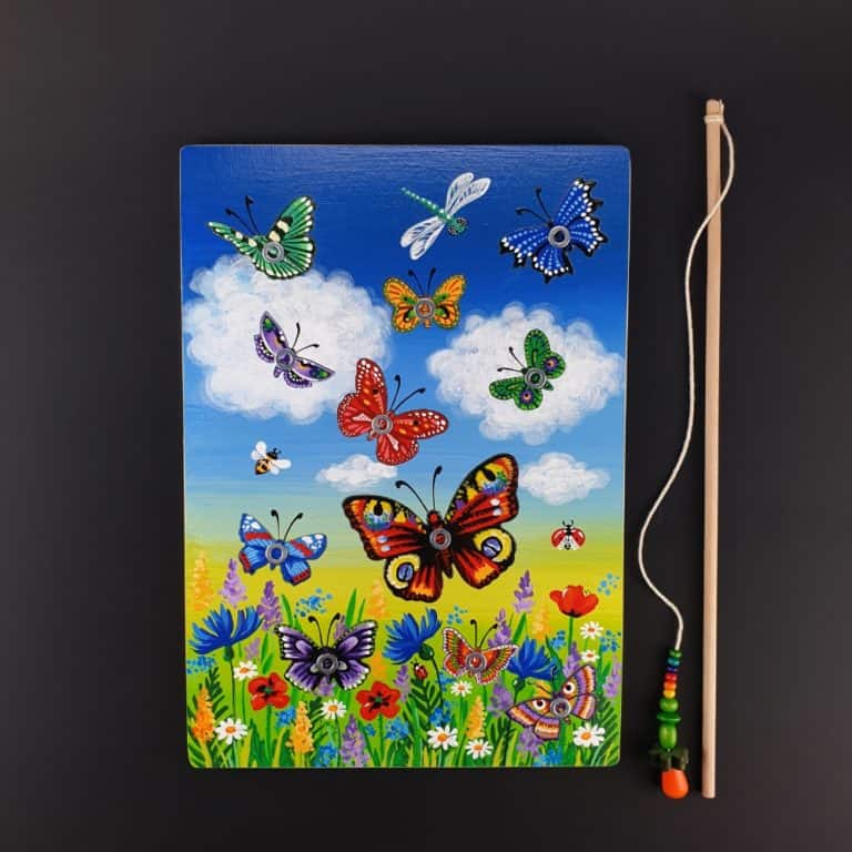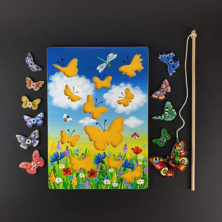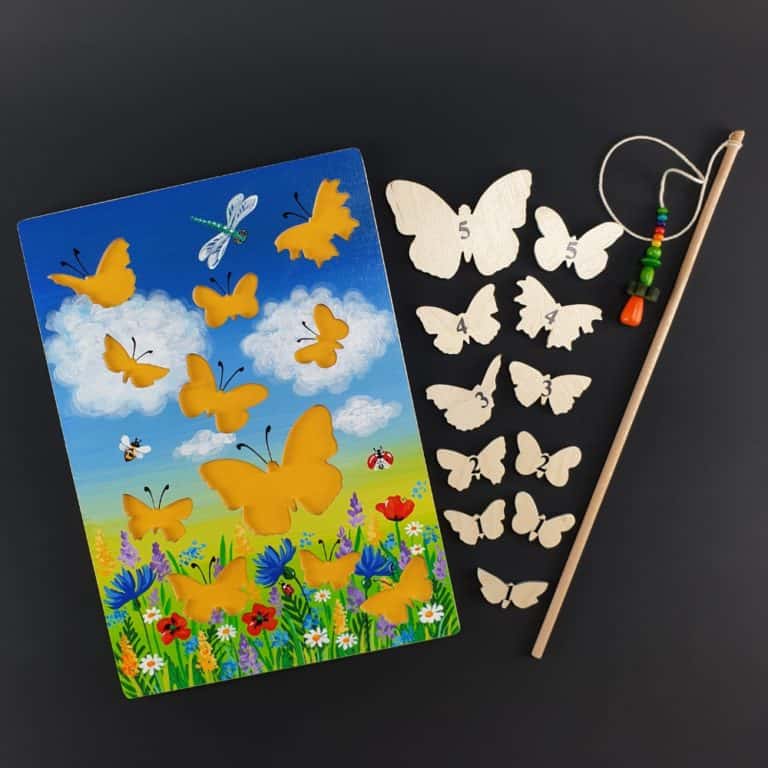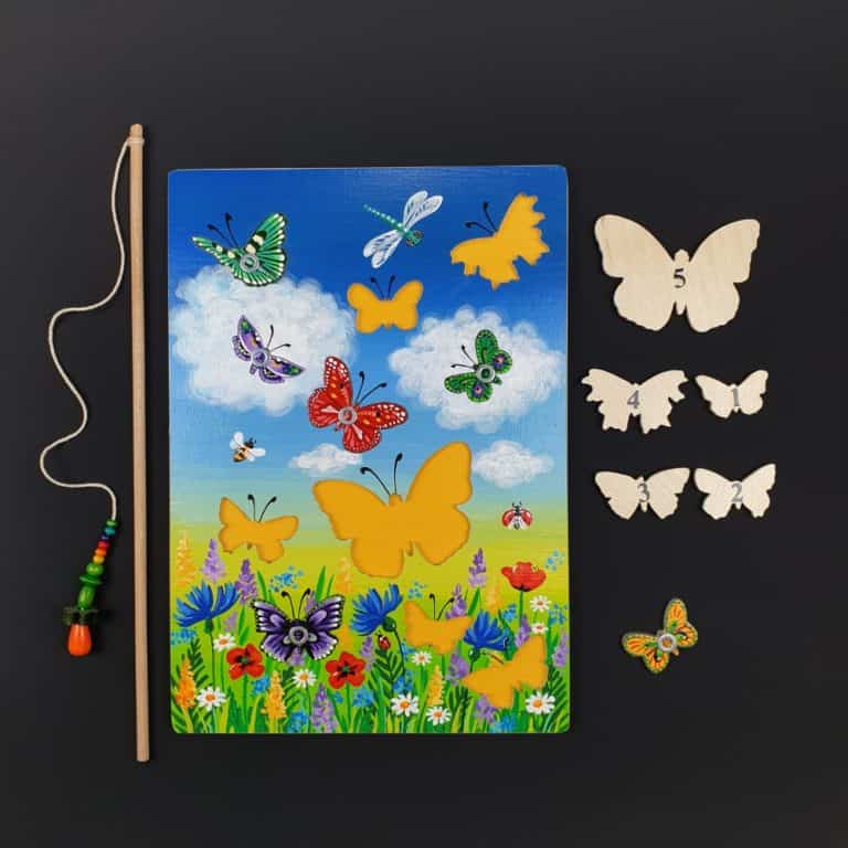 Šī krāsainā galda spēle, kurā ietilpst 11 tauriņi pamatnē (ziedu pļavā) un tauriņķeramais ar magnētiņu, ir lielisks rīks bērna abu roku koordinācijas, smalkās pirkstu muskulatūras, pacietības un koncentrēšanās spēju attīstīšanai. Spēle iepazīstina bērnus ar cipariem un jēdzieniem "liels" un "mazs", "daudz" un "maz", vienlaikus piedāvājot pirmās skaitīšanas iemaņas.