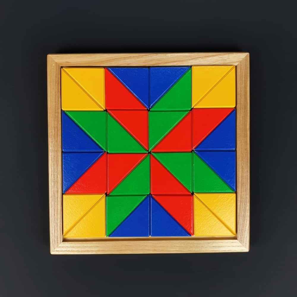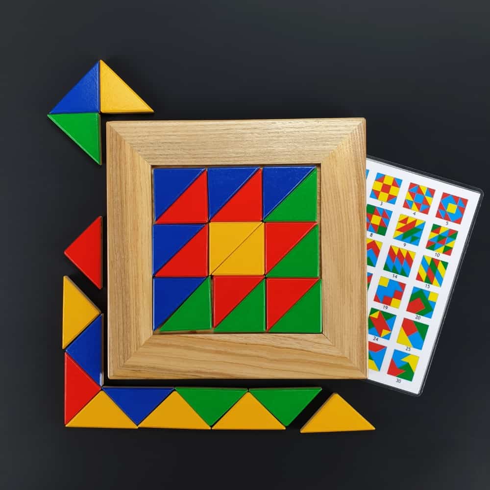 Spēles komplektā ir 32 trīsstūri – 8 trīsstūri četrās krāsās. Šie trīsstūri ir krāsoti no vienas puses, otrā atstājot dabīgo koku, lai darba vide būtu patīkami organizēta. Ornamentu veidošanas uzdevumiem piedāvājam rāmīti ar divu veidu izmēriem – izņemot trīsstūrus un apgriežot rāmīti otrādi, atradīsiet mazāku rāmīti, kas paredzēts darbam ar 18 trīsstūriem.