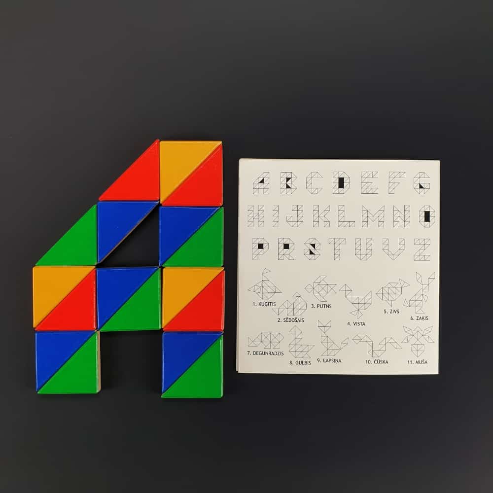 Uzdevumu daudzveidība ir pārsteidzoša – no trīsstūriem var veidot dažādas formas, piemēram, kvadrātus, trapeces un pat burtus un ciparus. Uzdevumos iekļauti interesanti piemēri, kā salikt dažādas formas, kā arī norādīts nepieciešamo detaļu skaits.