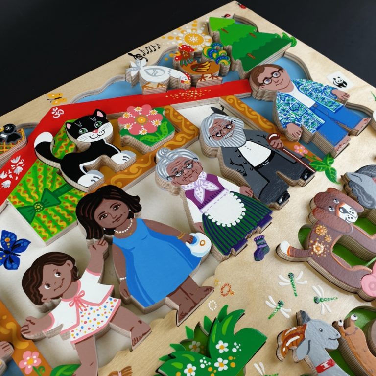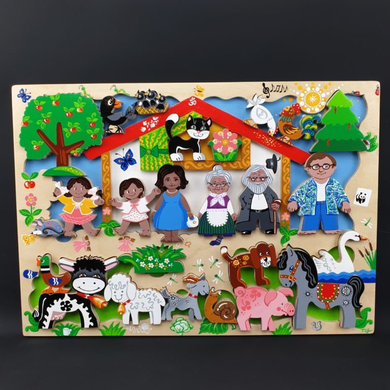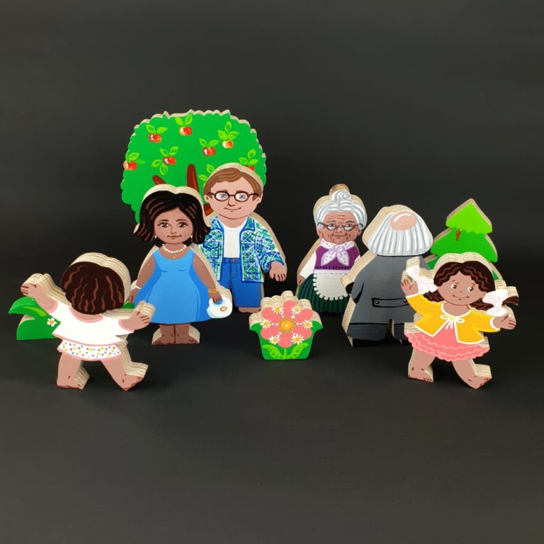 Figūriņu apgleznošana ir 100% roku darbs, kas piešķir katram komplektam unikālu izskatu. Sakārtojot figūriņas atpakaļ pamatnē, pievērsiet uzmanību mazajām norādēm: vectēvu norāda cepurīte, vecmāmiņu – adīklītis, meitenīti – lellīte u.t.t.
