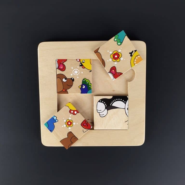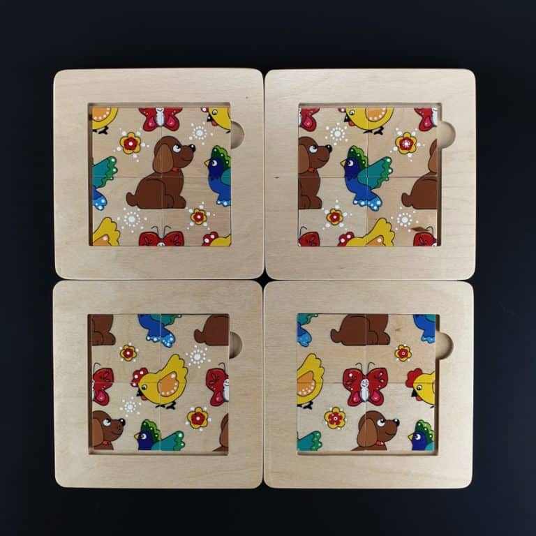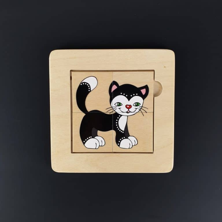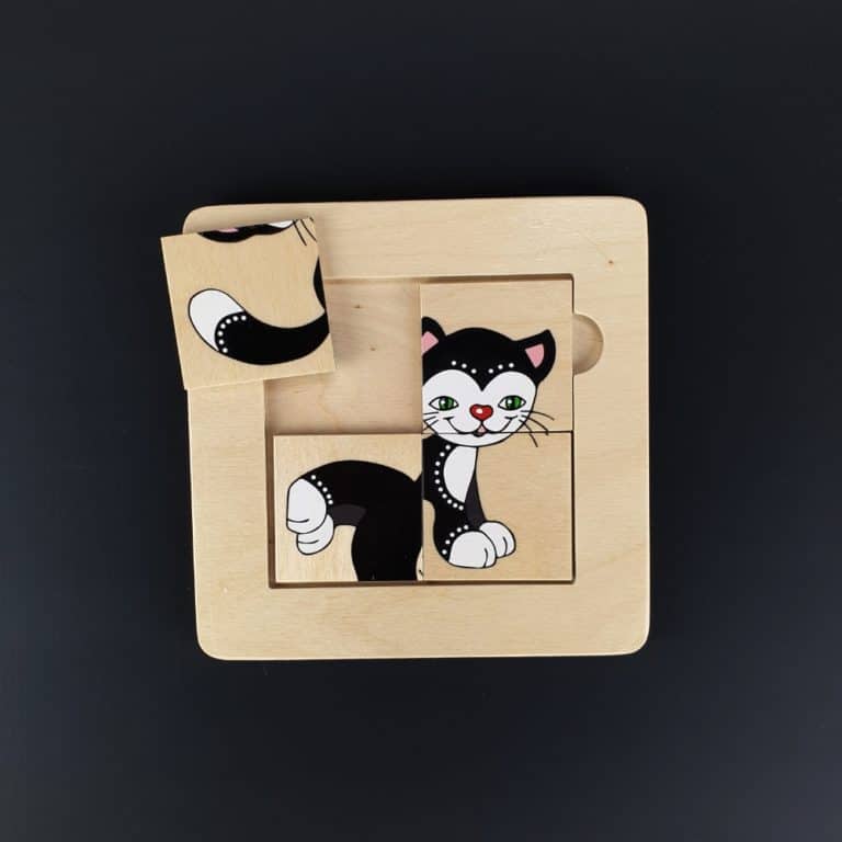 Šī rotaļlieta lieliski trenē loģisko domāšanu un kombinēšanas spējas. Uz vienas puzlītes puses ir attēlots melnbalts kaķis, kas palīdz vieglāk saprast, kā veidojas viens vesels attēls. Kad šis princips ir izprasts, bērns var pāriet uz puzlītes otru pusi, kur apgleznoti četri dažādi attēli: taurenītis, suns, putns un vistiņa. Šīs bildītes izaicina bērna loģisko domāšanu, kombinēšanas spējas un koncentrēšanās spējas.