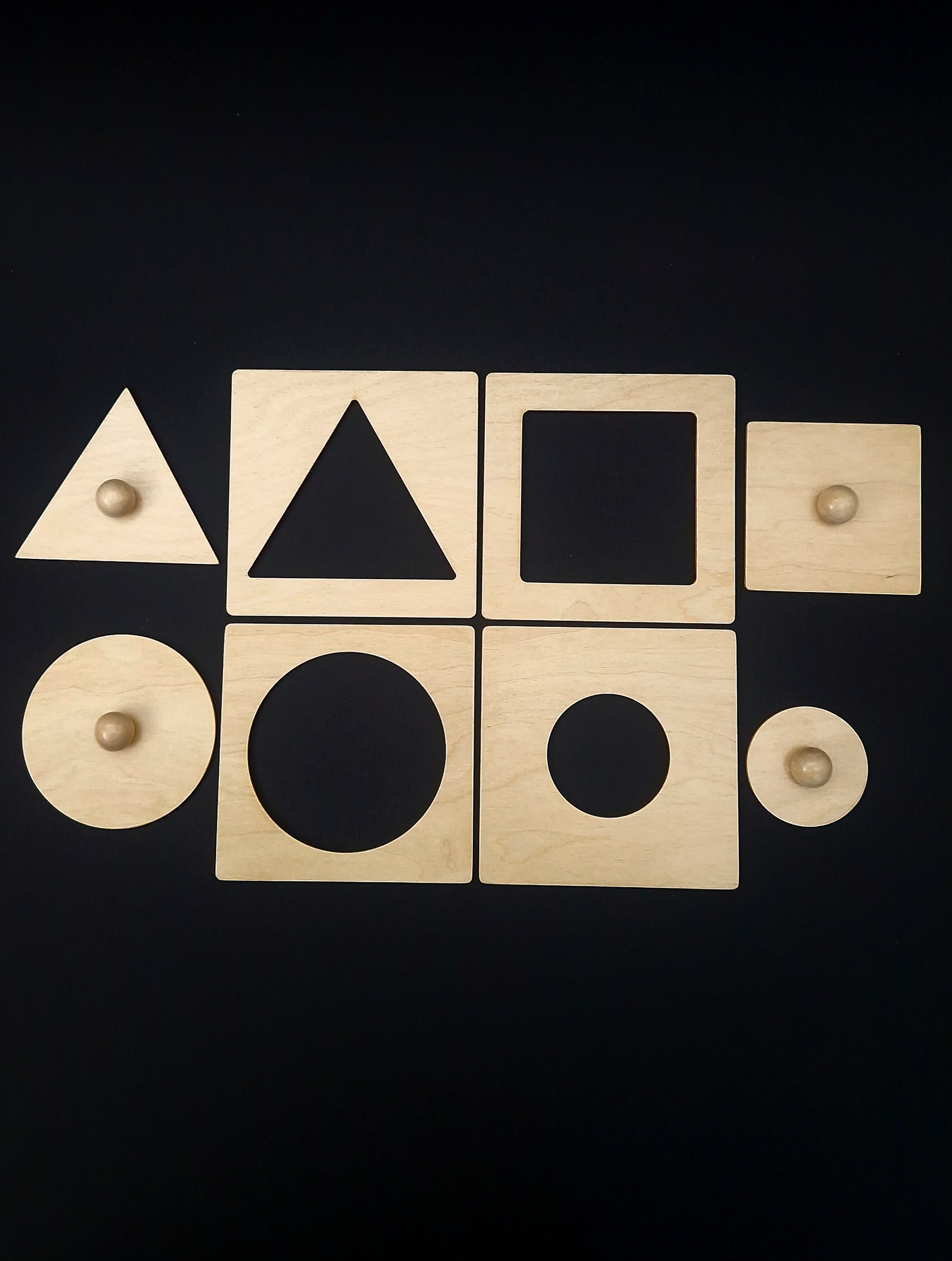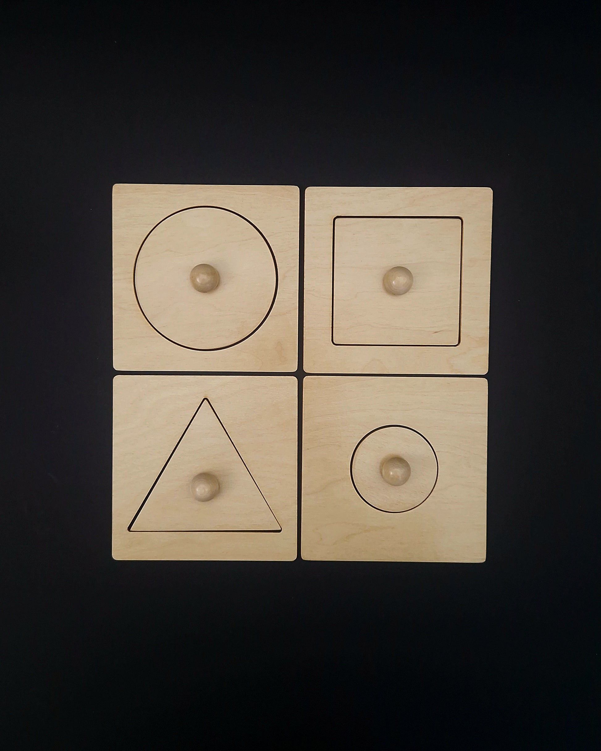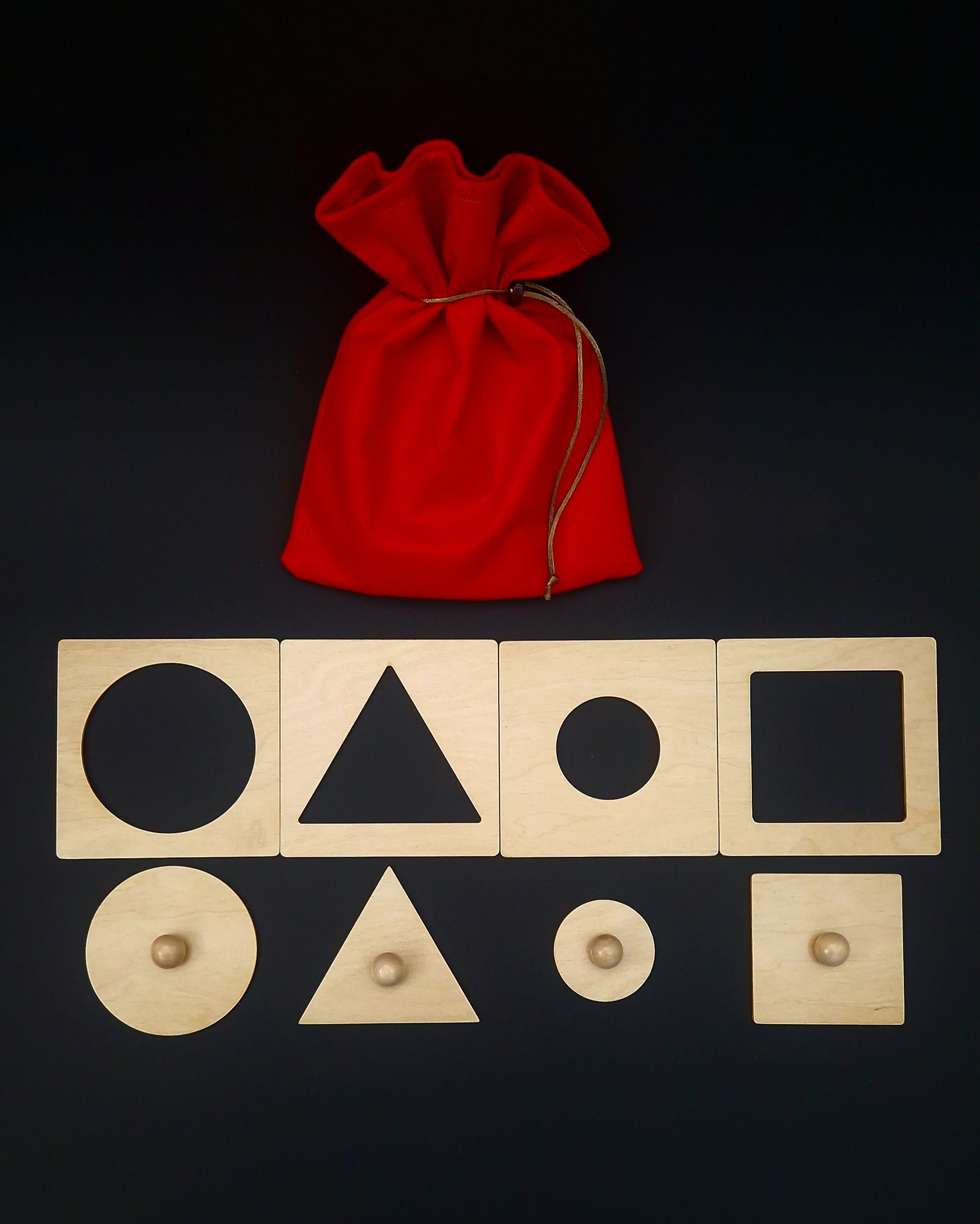 Minhenes funkcionālās attīstības diagnostikas testa materiāli - koka rāmji ar ģeometriskajām figūrām.