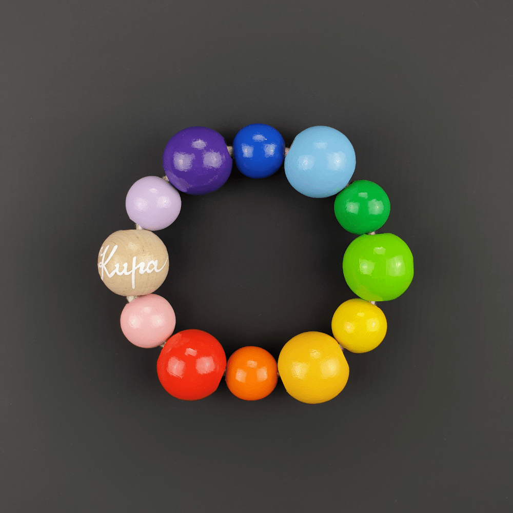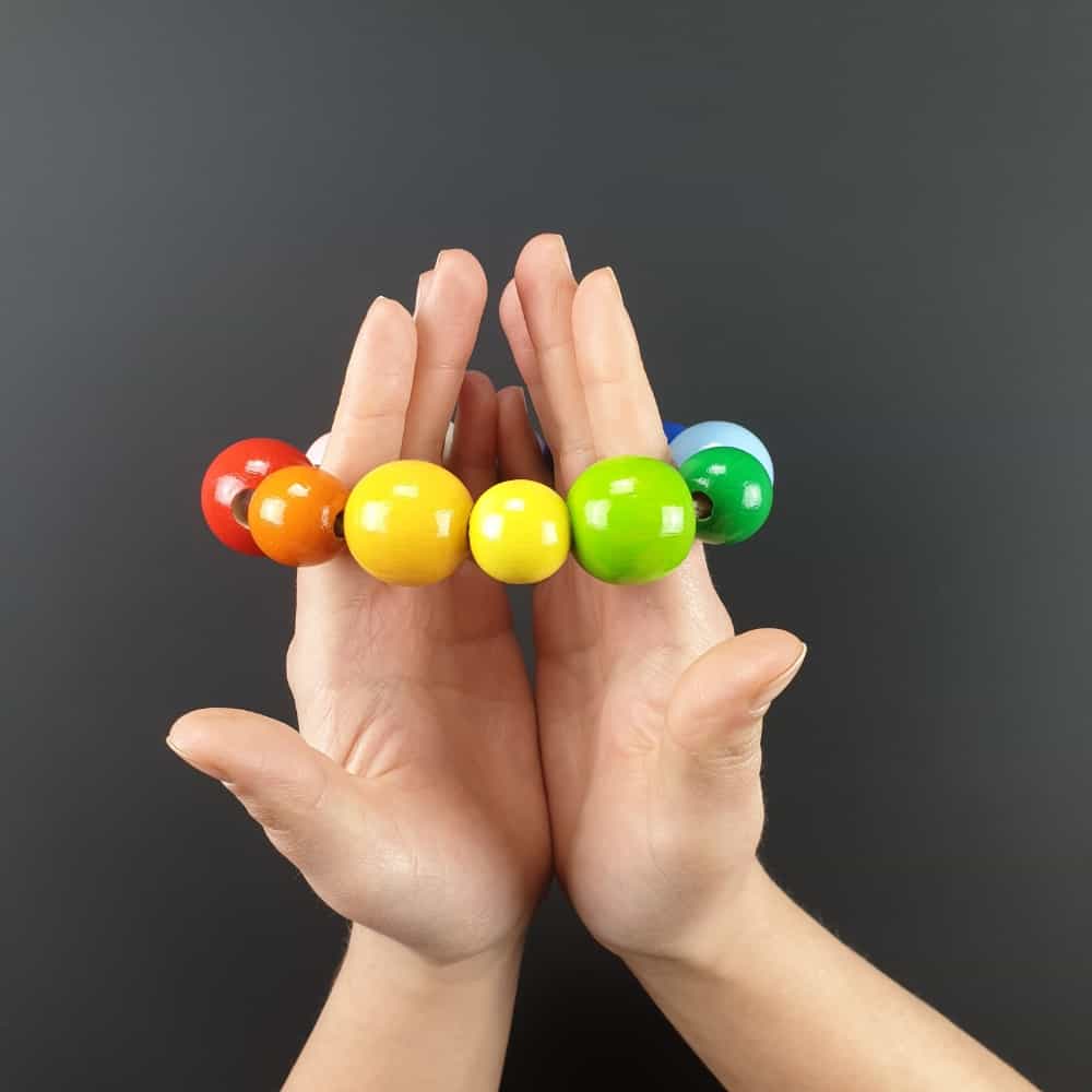 Krāsotas ar ekoloģiski tīrām krāsām un ar rokām gatavotas, šīs krellītes ir 100% droša attīstošā rotaļlieta pirkstiņu un rociņu trenēšanai.