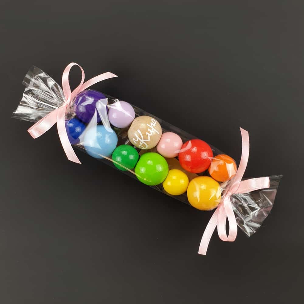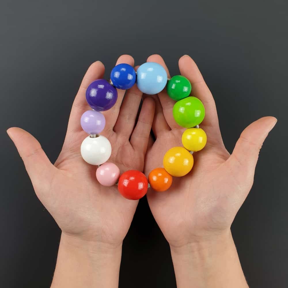 Bumbiņas krāsotas varavīksnes krāsās. Krāsas ir pietiekami košas, lai piesaistītu bērna uzmanību, bet ne tik košas, lai nogurdinātu. Tādēļ šī rotaļlieta ir lieliski piemērota ņemšanai līdzi garākos pārbraucienos ar ratiem, vai kādai ciemošanās reizei – ērti ielikta somiņā manta īstajā mirklī piesaistīs mazuļa uzmanību un nomierinās.