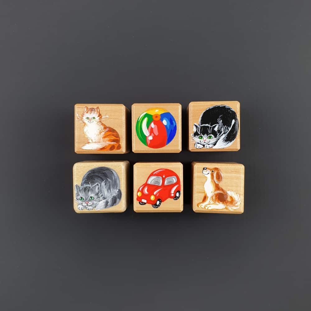 С кубиками в юном возрасте – никаких проблем на уроках математики! Универсальные кубики-игрушки для самых маленьких. Раскрашенный вручную рисунок и блоки, раскрашенные вручную, 9 шт., размер кубиков 3х3 см. Рекомендуется давать кубики малышу с возраста около 5 месяцев – с момента появления на свет. ребенок может держать в руках небольшой предмет. Таким образом «разжимается» кулачок маленького ребенка. Для маленького ребенка мы рекомендуем выбирать игрушки основных цветов. Чтобы малыш почувствовал разницу между разными материалами, специалисты рекомендуют предлагать ребенку деревянные кубики. Когда вы дадите кубик маленькому мальчику, вы уже сможете назвать цвет данного кубика. Эта информация остается в памяти малыша. Когда малыш учится сидеть, возможности игры расширяются. Родители могут строить простые конструкции, например, башни. Обычно малыш разбирает конструкции и радуется этому, ведь для него это открытие: только что была башня, а теперь ее нет! Таким же образом ребенок пытается познать мир. Не беспокойтесь о том, что ребенок будет бросать кубики. Так формируется понимание причинно-следственных связей – я поднял, уронил, раздался шум, и предмета у меня в руках уже нет. Чтобы побудить малыша ползать, родители могут выстраивать стопки из кубиков подальше от ребенка – говоря, подойди поближе… В возрасте около года желательно, чтобы ребенок уже умел складывать 4 кубика. блоки, расположенные один над другим. Родители должны демонстрировать такие навыки строительства башен неустанно – снова и снова. А когда малышу уже удается сложить два кубика друг на друга, родители проявляют неподдельную радость достижениям малыша. Так, шаг за шагом, башня «вырастет» очень высоко. 🙂 Такие занятия развивают координацию движений, чувство равновесия, концентрацию, целеустремленность и терпение. А также дарить огромную радость за великие достижения. 🙂Когда строить башни уже не сложно, появляется новое задание – нужно сложить все кубики обратно в коробку. Примерно в полтора года малыш сможет сортировать данные кубики по цвету. Положите синий блок поверх синего блока, красный блок поверх красного блока и т. д. Игра с блоками развивает: - зрение, осязание и слух одновременно - точность хвата и движений рук - статическое чувство равновесия - пространственная ориентация - взаимодействие глаз и рук - логическое мышление - способность систематизировать