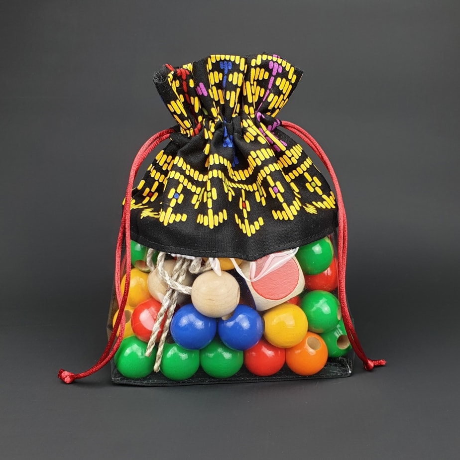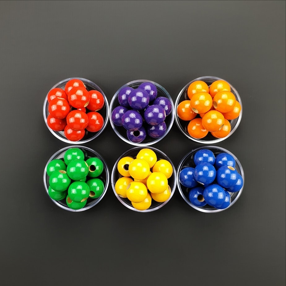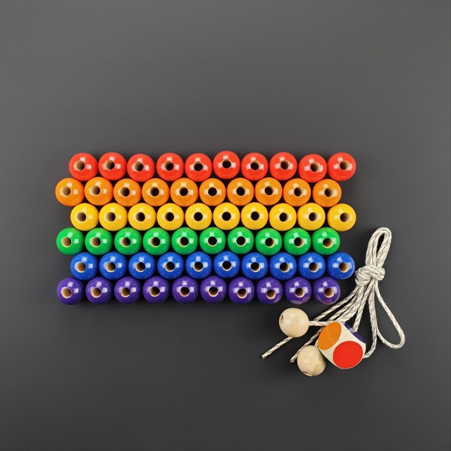 Игра состоит из 60 шариков (10 красных, 10 оранжевых, 10 зеленых, 10 синих, 10 желтых, 10 фиолетовых), 1 цветного кубика и 2 ниток (специально подготовленных для приятного вращения - точность хвата и движений рук - глазомер). сотрудничество рук. Чтобы сделать нанизывание более комфортным, рекомендуем перед заправкой ссыпать бусины в плоскую емкость или корзину. Когда ребенок уже освоил навыки нанизывания, предложите навыки систематизации и уроки по цвету нанизывать на нитку, например, только красные шарики, затем. только зеленые, синие и т. д. Шарики можно не только крутить на веревочке, но и систематизировать по посуде. Интересное задание для тренировки концентрации внимания и внимательности: - один из взрослых нанизывает на одну веревку определенный цветовой ритм, а ребенок - на. его собственная струна повторяет это в точности. Вначале цветовой ритм может быть довольно простым (например, 2 зеленых шарика, 2 красных, 2 зеленых, 2 красных... и т. д.). Со временем сложность заданий должна увеличиваться. Играя так, ребенок также осваивает первые навыки счета. Игра для двоих: - разделите набор бусинок пополам. Оба игрока по очереди бросают кубик. Какой бы цвет ни выпал, игрок кладет шарик этого цвета на веревку. Если такого цвета нет, то ход нужно пропустить. Побеждает, естественно, тот, у кого первым закончатся шары. Игру можно дополнять. Перед поворотом необходимо назвать предмет цвета брошенного цвета. Игра для закрепления навыков счета у детей дошкольного возраста. В зависимости от количества брошенных очков шары должны попасть на веревку. Победителем игры становится тот, у кого на веревке окажется больше шариков. 🙂 Мы обращаем внимание на такие понятия, как больше-меньше. Также можем порекомендовать использовать наклеенные цифры. Их можно наклеить уже на кубики, входящие в набор. Поначалу можно начать с 1, 2, 3... чтобы игра не показалась ребенку слишком сложной. Позже, понемногу, можно будет складывать оставшиеся цифры – 4...5...6. Мы искренне желаем вам удачи и драгоценных мгновений вместе.